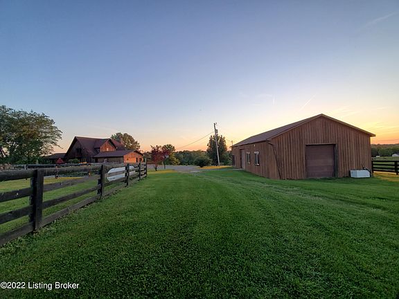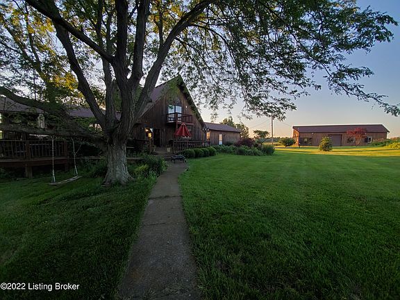 HUGE PRICE REDUCTION - RARE OPPORTUNITY!!! Just minutes from I-71, 30 minutes from downtown Louisville and only 10 minutes from LaGrange with grocery stores, shops, and restaurants. This custom built home was constructed by Esposito Construction. Sharing a property line with 136-acre Lake Jericho, this 3,197 sq. ft. home is strategically placed on 8.95 acres with a pond, where there is always the view of spectacular sunsets and rolling pastures. 3 bedrooms 2.5 bath home features an open floor plan with a great room opening to a large, vaulted ceiling with a massive stone fireplace accenting a wall of windows. Sliding glass doors open to the wrap-around deck. The large kitchen is a chef's dream, with granite countertops adorning a huge Island perfect for cooking and entertaining A multi-functional mudroom/laundry room also features built-in cabinets and sink that doubles as a staging area for the kitchen with an extra two ovens for those big family events or parties. The first floor has two bedrooms, 1 full bath and one half bath with plenty of space to create a first floor primary suite (owners have designed a second primary suite in existing space for visuals). On the sunny south side of the house there is a front to back sunroom, windows on all sides for sunset/pasture views, bird watching and occasional family of turkeys. The ground floor walk-out basement opens to spectacular sunset views and has its own large stone hearth fireplace. This versatile space is perfect for a family room or rec room. The second floor Primary Suite has a private deck for sunrise views and coffee. It overlooks the great room and features a walk-in closet and large bathroom. A library wall gives way to a sitting space/TV area for relaxing evenings.