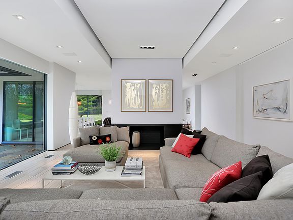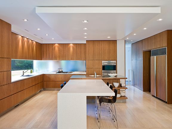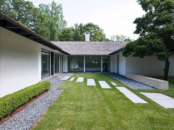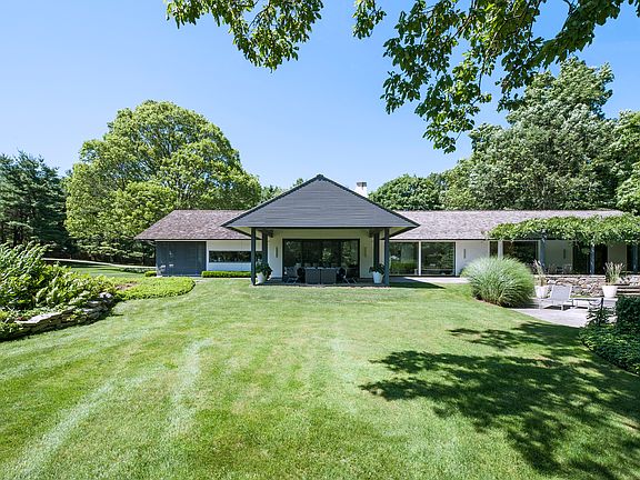 Award winning modern masterpiece, offered for the first time since its visionary renovation by Joeb Moore, is set on 3.4 secluded acres in Mid-Country with a pool, tennis court, expansive stone terraces and detached studio with a kitchenette. Originally designed by Peter Ogden this masterfully reimagined four bedroom, one level home was recognized by Elle Decor as 'The Most Enviable Glass House' and received first place from CTC&G Innovation in Design. Open floor plan, wonderful indoor/outdoor flow and floor to ceiling thermal pane Low-E windows framing the outstanding natural views. Scandinavian-inspired walnut panelled kitchen opens into a family room with a two sided fireplace and large dining area overlooking the backyard; enchanting glass enclosed home office.