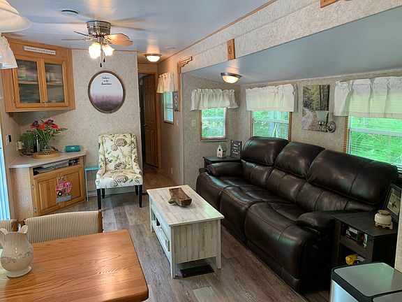 Deeded lot & fully furnished turnkey home in Klondike Campground Resort! All you could ask for…Outside, a well maintained lot, perfectly designed for entertaining, a tiki bar with stools, Adirondack chairs surrounding a fire pit, gorgeous stainless grill, 2 picnic tables & outdoor sink, all draped by swag outdoor lighting for nighttime use! If it starts to rain, the large shed is complete with table, chairs & sofa for you and guests. A 2nd shed offers extra storage off a solar-pathed driveway. A beautiful deck w/awning, leading into one of the prettiest campers I’ve seen…a hybrid park model that’s modern & clean, and seems as spacious as a park model. Beautiful rooms, central air & fully furnished including all turnkey items. Klondike Campground Resort is a gated community w/lg. clubhouse & lots of amenities, large newer pool w/poolside cafe, community fire pit, organized activities, on-site ponds, and so much more! CASH PURCHASE ONLY. Seasonal secondary residence only.