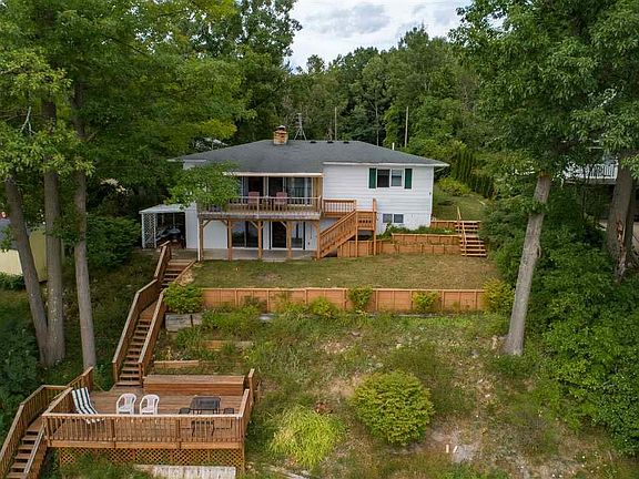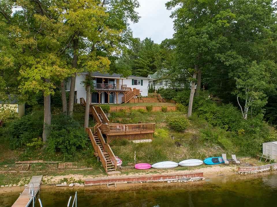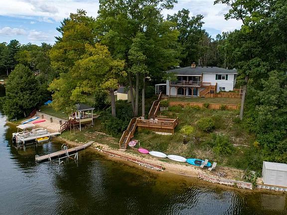 Waterfront home on Five Lakes! There is still time to enjoy summer water activities on this all-sports lake! There are two spacious decks making this home great for entertaining...catch gorgeous 180 degree views from the upper deck or catching rays on the lower deck. There is a flat sandy area where you can put your kayaks/canoes in the lake or get a boat as the dock and boat lift are included. The main floor of this home features three bedrooms, an open concept kitchen/dining/family room with a double sided wood fireplace with views of the lake. Lots of cabinet space in this kitchen and newer stainless steel appliances which includes a gas stove. Large master bedroom features a private bath and a view of the lake. Walk-out lower level offers an rec area with wood fireplace, laundry area and lots of storage. DNR maintained public boat launch and paved roads around the neighborhood. Enjoy the convenience of natural gas, high speed internet and just a 5-minute drive to US-127!