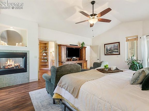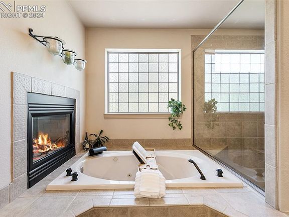 Welcome to Woodmen Oaks Estates, where this exquisite residence awaits on 1.5 acres of lush tranquility. This custom-built home offers a seamless blend of luxury and comfort, providing an idyllic retreat in the heart of Colorado. The main level features a luxurious Master Suite with a spa-like bath and expansive walk-in closet. Enjoy the serenity of your private fireplace or step out to the hot tub for a peaceful escape. An additional main-level bedroom offers convenience with an adjoining bath and walk-in closet. The living room, showcasing soaring 18-foot ceilings, floor-to-ceiling windows, and a striking wood-burning stone fireplace, exemplifies masterful design. The gourmet kitchen is equipped with double ovens, a new gas range, and a wine fridge, perfect for creating culinary delights. Step outside to a spacious patio with a soothing water feature, providing a private haven. The thoughtfully designed laundry room leads to an expansive secondary suite, ideal as a home office, teenager's sanctuary, or in-law suite. With lots of natural light, a gas fireplace, and custom built-ins, this space is a versatile retreat. The main level also includes an office with elegant glass doors, offering flexibility for open-concept living or a more private setting. This room can easily transform into a formal dining area, perfect for entertaining. Descend to the basement to discover a spacious family room with a wet bar and another gas fireplace, ideal for hosting gatherings. Enjoy direct outdoor access or a movie night in the home theater, complete with all equipment. Three additional bedrooms and two bathrooms complete the well-appointed floor plan. Recent updates include refinished hardwood floors, new carpeting, and fresh paint in many rooms, ensuring this home is move-in ready. Experience the pinnacle of luxury living in Woodmen Oaks Estates and discover the unmatched elegance and tranquility this home offers.