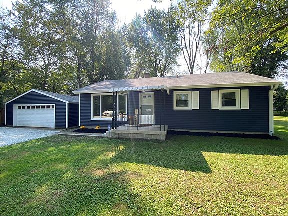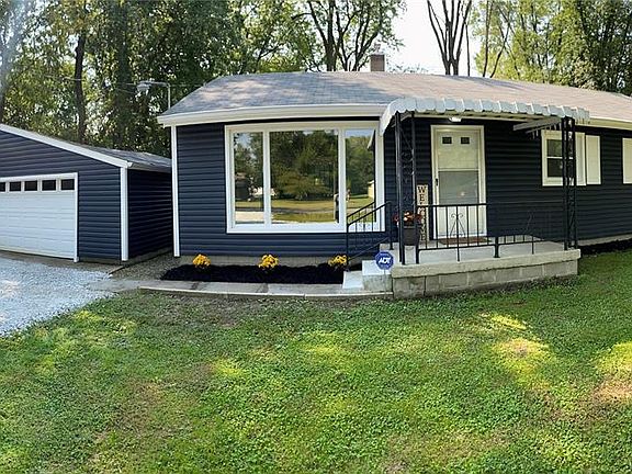 Nearly 1 acre setting with numerous updates that makes this home look like new! Kitchen has been totally updated with new cabinets along with hands-free faucet, new stainless steel refrigerator, microwave, gas stove & dishwasher. Breakfast bar area between kitchen & LR. All new flooring throughout with plush carpeting in all 3 bedrooms. The primary bedroom has a bathroom typically found in high-end homes with fully titled walk-in shower; 2nd full bath has a shower/tub setup that is tiled; both bathrms brand new. LR with large picture window for loads of natural light; updated electrical box; Covered front porch & enclosed rear patio along with open concrete patio; oversized 2 car det garage with ample shelving; XLG mini-barn & large yd