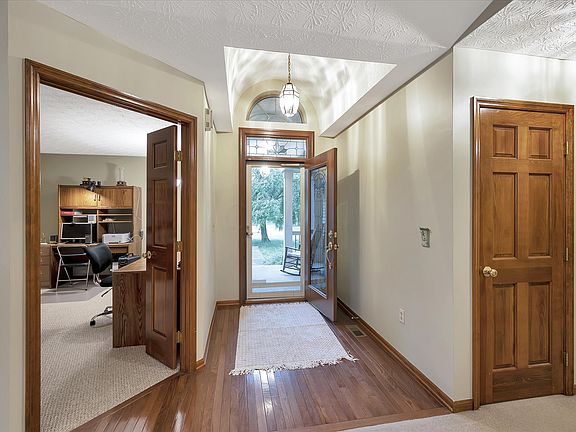OPEN SATURDAY 7/8 NOON-2 PM! This 3-bedroom, 2.5-bath ranch w/walk-out lower level has it all! From the welcoming front porch to the expansive patio this just feels like home! Features include: Foyer w/beautiful door & transom; great rm w/cathedral ceiling, gas-log fireplace, skylights; private den/office; beautiful kitchen w/SS appliances, granite countertops, pantry, desk; dining rm; hall bath w/Safe-Step tub; sun porch w/ceiling fan overlooks park; main-level laundry rm. The owner's suite has a large, walk-in closet & access to private bath w/double sinks & step-in shower. Lower level has finished rec room w/built-ins & electric fireplace. So much storage!!! Extra deep 2-car garage! The half-acre lot is on a cul-de-sac, has mature trees & backs to a park! This is a must-see property!