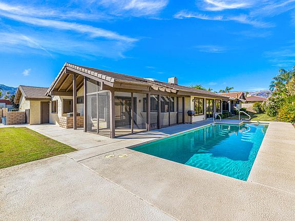 Located in heart of prestigious Indian Wells with tranquil vibe and non-gated this traditional home has remarkable, panoramic views of the Eisenhower and Santa Rosa Mountains! Light ceramic tile throughout, home has new paint and new carpets in bedrooms and Living Room. Home boasts 2338 Sq. Ft., 3 spacious Bedrooms, 2.5 Baths, 3 car garage, Laundry Room, built 1979, situated on gorgeous 12,196 Sq. Ft. lot. Rear yard pool is perfect to swim laps and lovely north green lawn extends on both the east/ west side. Walk out from Kitchen and Informal Dining area to screened in patio, great for family entertaining and relaxing. Gated Courtyard entry welcomes you to an open Living Room /Dining Room with high ceilings featuring 3-sided white brick fireplace. Primary Bedroom has sitting area and sliders out to private patio all with fabulous south Mountain views. Primary Bath has big walk-in closet with built-in cabinets, dual sinks and vanity, cultured marble countertops, shower and jet spa. One Guest Bedroom has beautiful views of mountains and would be perfect for home office. Kitchen has plenty of storage, white tiled countertops, great views to the pool. Indian Wells residents are offered special amenities and discounts at the exquisite IW golf resort, tennis gardens, restaurants, and hotels only a short distance away!