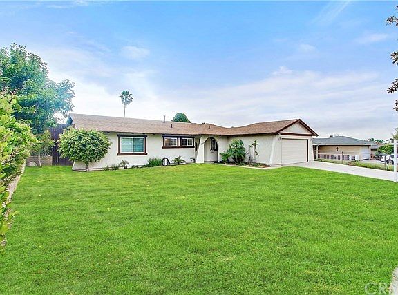 Lovely 4 bedroom 2 full bath single story home . New wood laminate flooring in living room, hall, and all bedrooms. Tile floor in kitchen, dining room and bathrooms. Living room has ceiling fan, and new tile veneer gas fireplace. Kitchen has newer wood cabinets, granite countertops and white appliances. Dining room has brush nickel light fixture and slider out to covered patio. All bedrooms have ceiling fans. Master bedroom has double closet and master bathroom recently updated with new tile, fixtures, and vanity. Nice backyard with above ground pool and above ground Jacuzzi. Large front yard. Close to schools and shops.