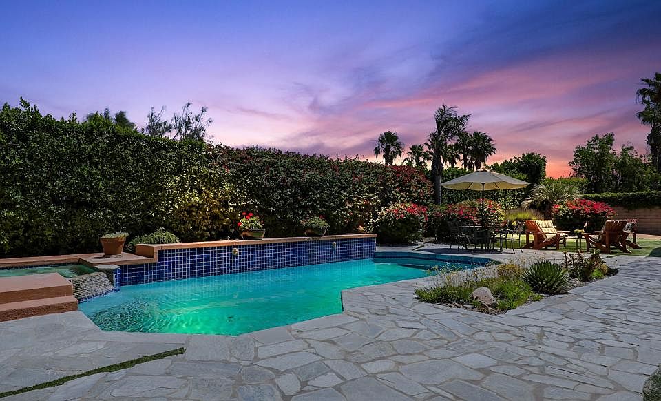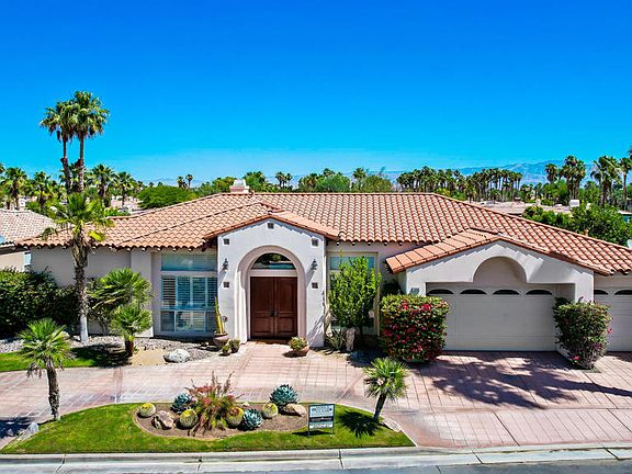 Welcome to Sunterrace, one of the ''Hidden gems of the Desert''. This sought-after neighborhoods shows obvious pride of ownership. The home offers unparalleled privacy and a serene lifestyle, ideal for those seeking a tranquil retreat. Entering the foyer, you are greeted by a light and expansive open floor plan that seamlessly blends elegance and functionality. The gourmet kitchen is a culinary enthusiast's dream, featuring high-end appliances, ample counter space, and a spacious island perfect for casual dining and entertaining. Adjacent to the kitchen, you'll find a charming dining area as well as a formal dining room, creating the perfect setting for hosting memorable gatherings. The master suite offers a large ensuite and 2 closets, and a lovely view of the pool. It also includes a private office, providing a quiet space for work, personal projects or a work-out room. The backyard is an oasis for relaxation and enjoyment. The sparkling pool and spa invite you to unwind and soak up the sun, with a putting green. With ample space for dining, entertaining, or simply relaxing, this backyard is a true haven for outdoor living. The air-conditioned 3-car garage is equipped with an EV charging station, ensuring convenience for EV owners. It is centrally located, only moments away from many entertaining and dining and activity options - El Paseo, The River, The Living Desert, biking and hiking activities, and so much more.