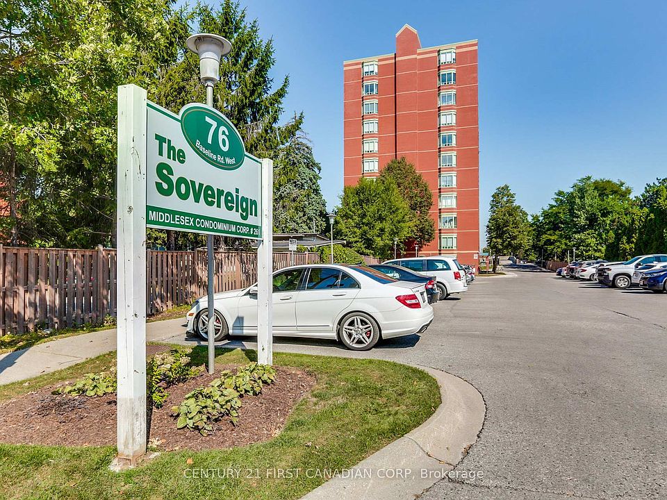 Turn-key 2-bedroom, 2-bathroom, corner unit condo in London South! Welcome to this beautifully maintained second-floor condo corner unit at 201-76 Base Line Rd. W. Bright and inviting with a large bay window and loads of natural light, this carpet-free home offers plenty of upgrades throughout. The kitchen features refaced cabinetry, quartz countertops, a stylish backsplash, soft-close cupboards, and a custom pantry. Both bathrooms were updated in 23' with modern vanities, while the unit also boasts new laminate flooring 20'. Custom built-in storage with sleek sliding doors is found in the foyer and along the full width of the living room, adding both function and style. California shutters added in 23' in the bedrooms and patio door further enhance the space. Step out to a generous private balcony to enjoy the outdoors! The spacious primary suite offers a walk-in closet and ensuite, while convenient in-suite laundry is located in the main hallway. Building amenities include an exercise room, sauna, controlled entry, and plenty of parking. Fantastic location close to shopping, restaurants, parks, public transit, and so much more! Book your showing today!