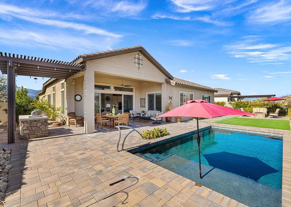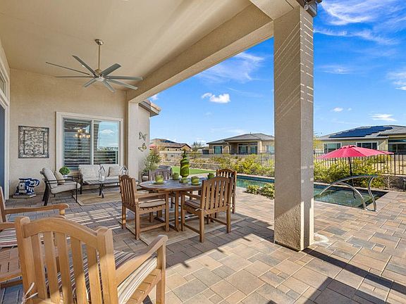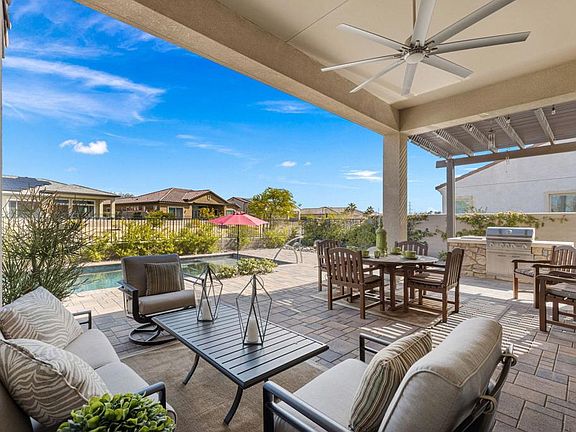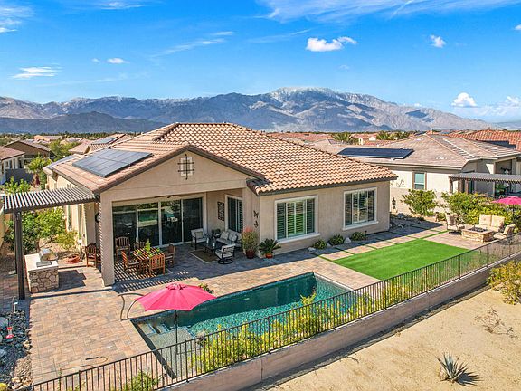 Fabulous design meets exceptional indoor-outdoor living! 76 Bordeaux at Del Webb Rancho Mirage calling! The loving care and detail that has gone into this home is noteworthy. 3 BD, 2 BA + den 'Serenity' model with 2,329 SF. Enjoy natural desert light galore at every turn. A series of clerestory windows work their MAGIC. Modern chef's kitchen takes center stage. Living and dining areas open to covered patio w/ adjacent pergola-covered built-in stone barbecue. Pool with Baja-style sunning deck. Stone firepit positioned ever so perfectly. Waterwise landscaping all around. Bricked, elevated herb + vegetable garden is a pleasant surprise in the gated side yard. En suite primary bedroom features direct pool access and expansive walk-in closet w/ custom built ins. A ''make-up vanity'' behind yet another door is all custom. Guest bedrooms #2 and #3 enjoy a nice separation. Den features handsome built-in cabinets and views to the front courtyard w/ fountain. Leased rooftop solar. This amenity-rich 55+ community in one of the desert's most desirable neighborhoods and conveniently located on Dinah Shore Parkway. 76 Bordeaux is positioned relatively close to the front gate. The best of Rancho Mirage, Palm Desert, and Palm Springs are a short hop away. Residents enjoy resort style pools, fitness center, tennis, bocce ball, pickleball, virtual golf, putting green, walking trails. Enjoy it all!