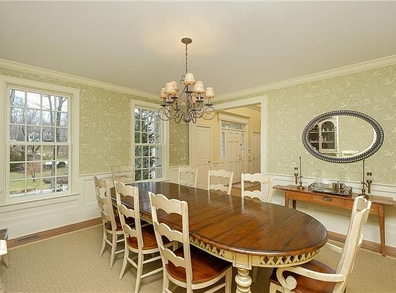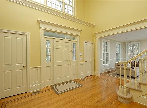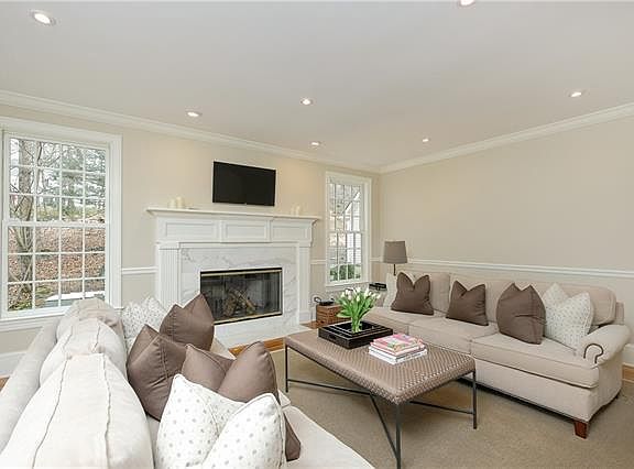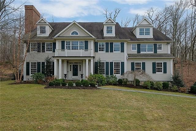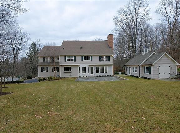 Superbly crafted Colonial designed with outstanding attention to detail & fabulous amenities offers elegant environment for gracious entertaining & effortless living. Oak floors, lavish millwork, dramatic ceilings, two marble fireplaces & oversized windows enhance the timeless character of the 5575-sf interior. Sophisticated main level highlighted by double-height entry foyer with powder room; beautifully appointed formal living & dining rooms; gourmet kitchen with stainless steel appliances, granite counters & breakfast room; adjoining family room with extensive built-ins & door to slate patio; and huge playroom. Four bedrooms & two full baths on second level includes king-sized master suite with dressing room, sitting room, his/her walk-in closets & luxurious marble master bath. Office and tiled mudroom with access to three-car garage on lower level. Private, park-like 1.63-acre setting includes future pool site and separate studio with living room, summer kitchen & half bath.