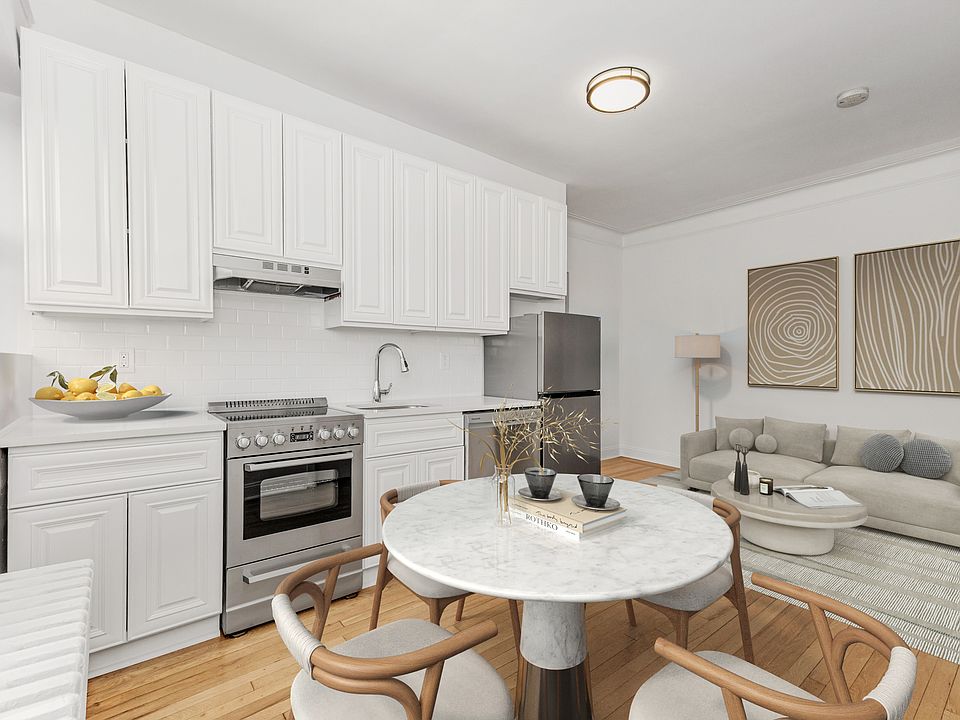 High ceilingsLarge street-facing windowsStainless steel appliancesSleek modern kitchenExtra storage optionsBright queen-sized bedroomIconic tree-lined streets