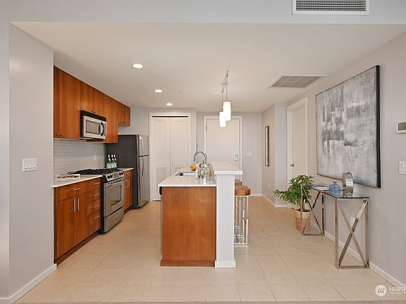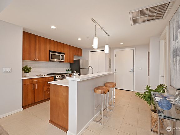 Fabulous top floor penthouse unit with western views of the sound and city in the sought after Parc Condominium. Features an open concept floorplan with sunlit filled rooms, high ceilings and large windows. Kitchen with quartz countertops, stainless steel appliances, gas stove, bar seating. Primary bedroom with walk in closet. Spacious bathroom. In unit washer/dryer. Air conditioning. The Parc provides an amazing rooftop deck with sound and city views, 24 hour concierge, fitness center, owners lounge, guest suite and more. Secure parking. Storage unit. Pets ok. No rental cap. Minutes from the waterfront, Sculpture Park, Pike Place Market, Space Needle. Close to restaurants, cafes and shopping. Ultimate downtown condo on the penthouse level.