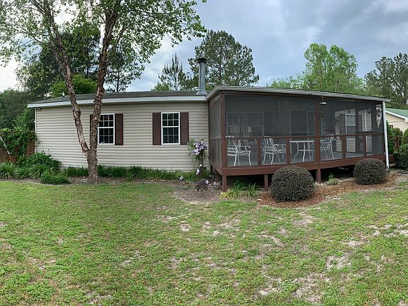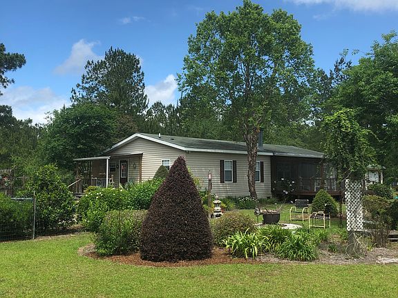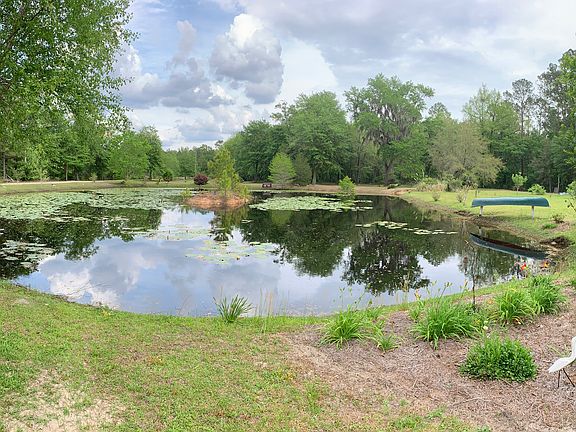 This beautiful two bedroom retreat on 5 acres has new Luxury Vinyl Plank flooring in living, dining, and main Master Bedroom. Kitchen has plenty of counter space and storage with center island. New fridge, dishwasher, and water heater. HVAC replaced in 2017. Spacious utility room with extra storage, slop sink and room for a deep freezer. Large 20x13 front screened in porch and an 8x12 covered porch out back. Ample parking with carport and spacious 20x20 detached garage. Large pond and well manicured grounds with gorgeous flowering and fruit bearing plants. Outbuildings include a chicken coop, garden shed, and a lean to perfect for livestock. Multiple trails throughout wooded area to enjoy with golf cart or 4 wheelers. Lockable gate at property entrance.