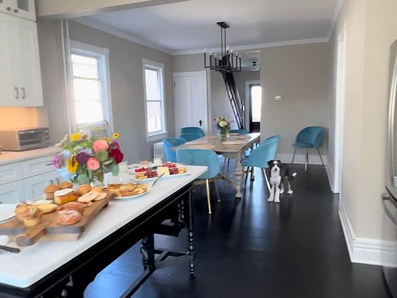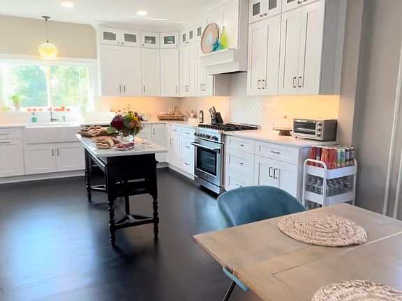 Inside your find gorgeous renovated bathrooms, a beautiful kitchen with newer appliances, center island, farm sink and modern light fixtures, stained floors and washer / dryer in the mudroom.