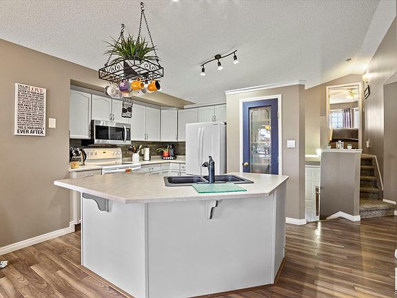 Looking for a spacious heated attached garage to work on your hobbies? How about 28 ft X 23 ft interior measurements!! Your search ends here with this modified bi-level boasting A/C in the coveted Creekside area. Step into a welcoming foyer featuring wide staircases leading both up and down. The main level seamlessly transitions with an open-concept kitchen and living area and vaulted ceilings, perfect for effortless entertaining. Additionally, find a second bedroom and 4-piece bath on this level. Ascend the stairs to your expansive private primary bedroom, complete with its own 4-piece ensuite and stunning windows. The well-lit basement offers a fantastic family area, a third bedroom, and a 3-piece bathroom. Outside, enjoy a fully fenced yard, a fantastic two-tiered deck, and a hot tub for those chilly evenings. Some upgrades include shingles 2018, H/W tank 2022 and hot tub 2020.