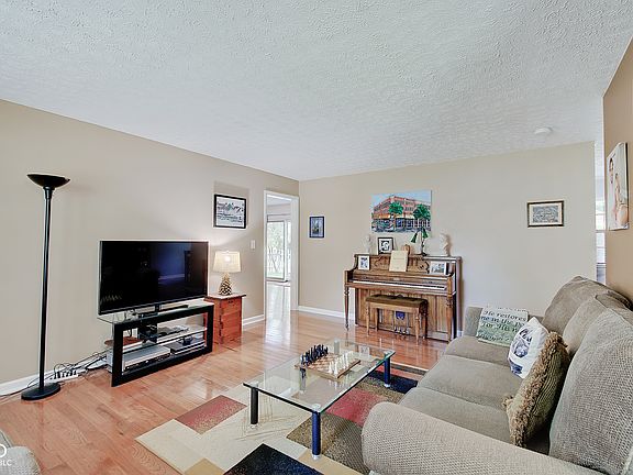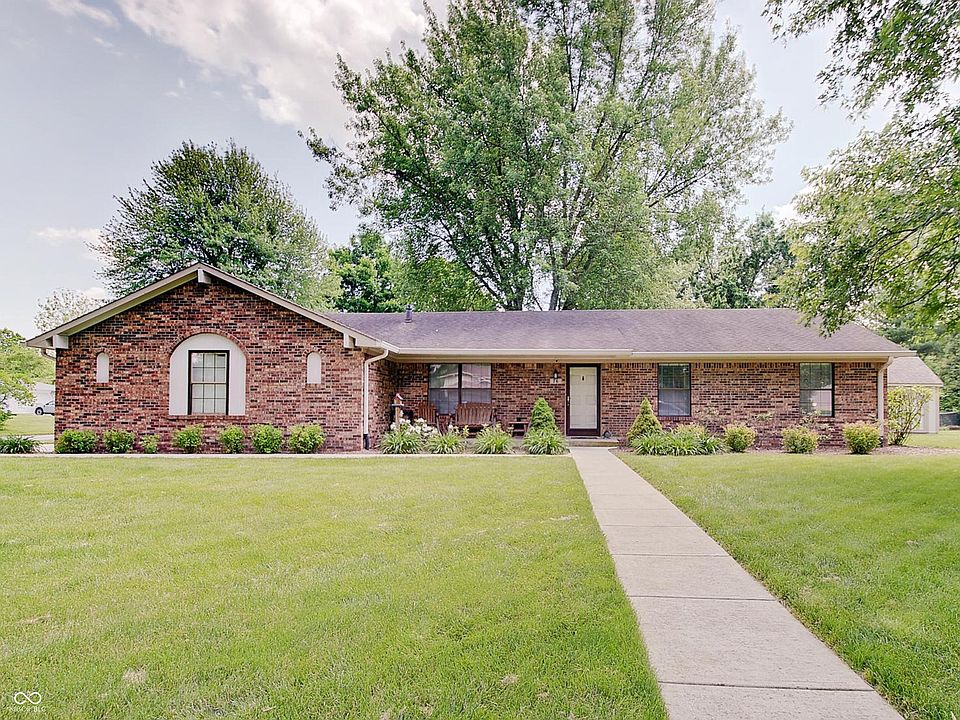 Don't miss out on this fabulous ranch home in Center Grove schools located on a corner lot, on a cul-de-sac, with beautiful mature trees! This brick home with front porch features 3 bedrooms, 2 full baths, and 2 car garage! Kitchen has been updated with lovely granite countertops, neutral tile floors, and stainless steel fridge and electric stove. This ranch floor plan offers 2 living spaces - Living Room and Family Room. Family Room features a cozy gas log fireplace and a fenced in concrete patio space outside the sliding glass doors. Mini Barn in the backyard for more storage space. Hall Bath features: tiled tub/shower combo and tile flooring, and Primary Bath has a tiled shower, tile floors, and a linen closet. Gorgeous real hardwood floors throughout the home - no carpeting!