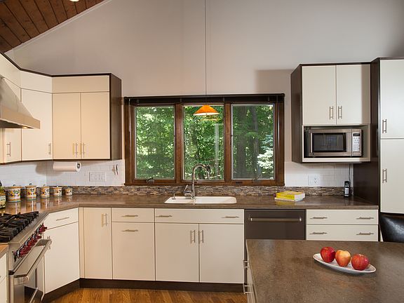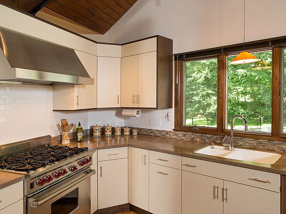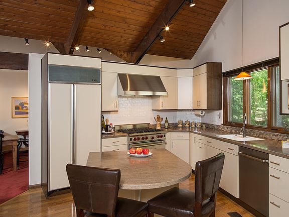 Multiple offer situation, Highest and best by Saturday at 7:00. Unique and spectacular contemporary nestled in the woods on over an acre of parklike grounds. Open floor plan and soaring ceilings. Cook's delight kitchen featuring Woodmode cabinets and Corian counters, Wolf 6-burner stove and SS appliances. Main floor master bedroom suite and additional home office/bedroom. Second floor overlooks living room and features 2 bedrooms and a bath. Whole house generator. Well maintained inside and out. Perfect for entertaining in all seasons.