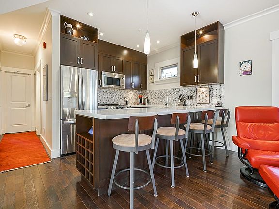 Quality built townhome by Trasolini Chetner in the rarely available & highly desirable Mount Pleasant community. With over 1,400 sq.ft, this unique 2 bed, 2 bath bright corner home fts. windows from 3 sides, over-height 9' ceilings, in-floor radiant heating, crown moulding & custom millwork. The open floor plan includes a chef-inspired kitchen with S/S appliances, gas range cooktop, expansive quartz countertops & spacious living & dining rm wrapped in stunning dark hardwood flooring. Built in speakers & gas F/P w/ stone surround adds to the ambience. A private & quiet, 134 sq. south-facing rooftop deck is perfect for mountain gazing & summer BBQs. 1 covered parking & storage incl. Footsteps to Mount Pleasant's best retail shopping, coffee shops & restaurants & 1 blk to Mount Pleasant Park.