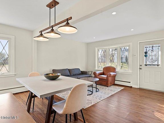 This 3 bed 1 bath home has an emphasis on open living spaces! The kitchen serves as a focal point of both style & functionality. Adorned with stainless steel appliances, a range hood & sleek quartz countertops. The built-in serving area offers a touch of elegance & provides extra cabinet space, ensuring that every kitchen gadget has its place. Adjacent to the kitchen, discover an additional living space featuring a gas stove, creating a warm and inviting atmosphere for gatherings. This area seamlessly connects to a 3-season room, offering versatility & the perfect setting for year-round entertaining. Outside, the deck is the perfect spot for barbecues & al fresco dining. Overlooking a lush green backyard backed by trees.