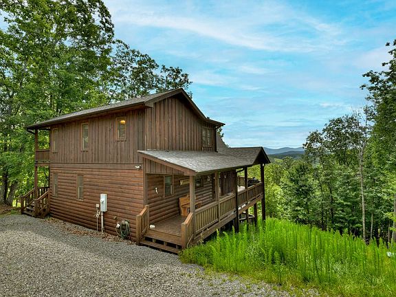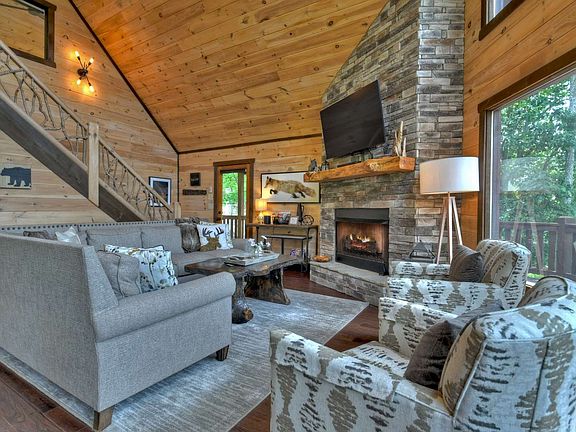 Million Dollar Views!!! Nestled amidst the breathtaking beauty of nature, this exquisite 3-bedroom, 3-bath cabin features a rustic log design and cozy wrap-around porch complete with a stone fireplace with seating area and hot tub. Step inside the spacious open-concept living area with vaulted ceilings, large windows that invite abundant natural light, and a magnificent stone fireplace. The kithcen is equipped with modern appliances, ample cabinetry, and a convenient breakfast bar for casual dining. The main level has a generous bedroom and separate bathroom/laundry. Upstairs you will find the private master suite with a balcony and ensuite. The terrace level offers a game room, wet bar, stone fireplace, bedroom, and bathroom. Step outside onto the expansive deck and be greeted by awe-inspiring panoramic views of the surrounding mountains. This fully turn-key cabin with great rental history is a must see!