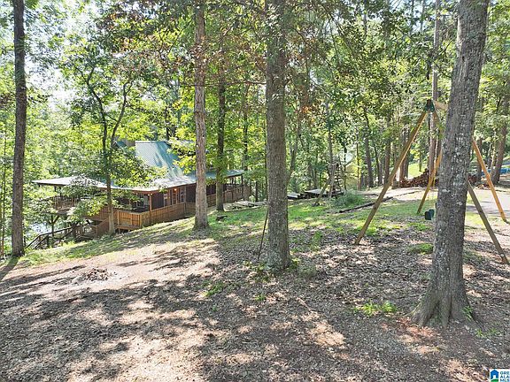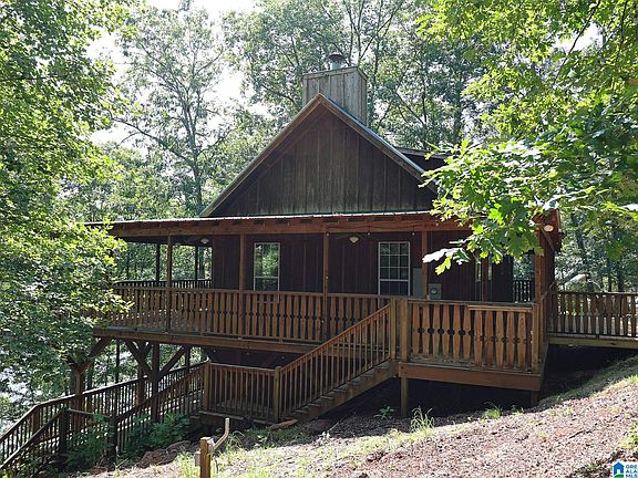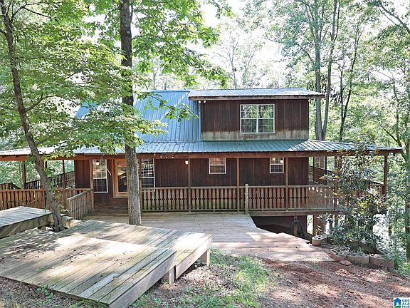3-bedroom/2.5 bath home with rustic cabin feel. Wood throughout the home both inside and out gives you the rustic feel of being in the mountains while having access to Lake Wedowee. The property offers .65 ac lot with 106ft of water frontage and a private dock. All paved road access conveniently located near I-20. This property is located on the Big Tallapoosa section of Lake Wedowee and offers much more privacy than other parts of the lake. There is a golf cart path that leads to dock no need for steps. Enjoy a beautiful view year-round from the covered porch overlooking the lake and the mountains across the water. This property is heavily treed with mature hard woods and shaded. Interior is complete with all appliances and a wood burning fireplace. The master bedroom is on the main floor. This property was once used as vacation rental so welcome investors! ** Home has a 500 gal Underground LP Tank