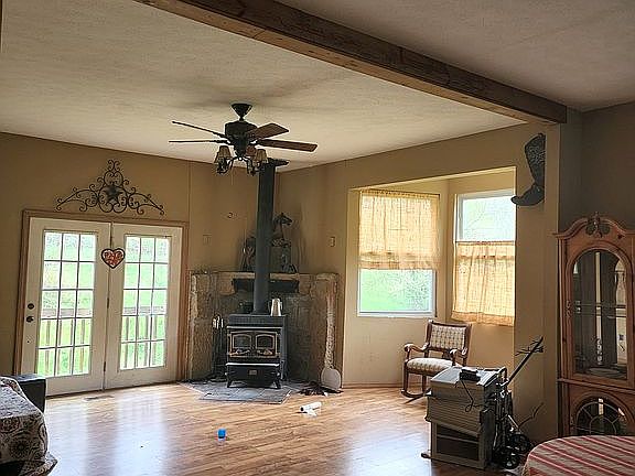 Small horse farm, rustic open floor plan, full basement. Horse Barn with small covered roundpen, chicken coop and run in shed. Well and city water.