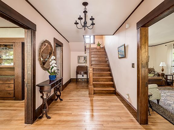 Location! Location! Location! Charming and elegant 1900’s Craftsman Foursquare 5 bedroom 2.5 bath home where old meets new in downtown Durham. From the moment you walk up to the front porch, this meticulously-maintained home will welcome you and your guests. Enter through a vestibule into a large front foyer. Spacious front-to-back living room features brick fireplace, hardwood floors, natural wood trim – a perfect room to curl up and relax or play games with friends and family. The dining room boasts beautiful built-in China cabinets and old-growth oak wainscotting. Kitchen with pantry, stainless steel appliances, antique zinc countertop, a one-of-a-kind ceramic backsplash created by a local artist Jeanette Dubela, and a breakfast nook. Continue upstairs where you will find four bedrooms and a full bath with a beautiful clawfoot tub. The third floor has a large primary en suite with sitting area and three-quarter bath with an extra-large tiled shower. Maple floors throughout, original wood windows, stunning stained hardwood trim are just some of the features that bring the charm of yesteryear and modern amenities of today. Landscaped lot within walking distance to downtown, schools, UNH, library, and pool. .