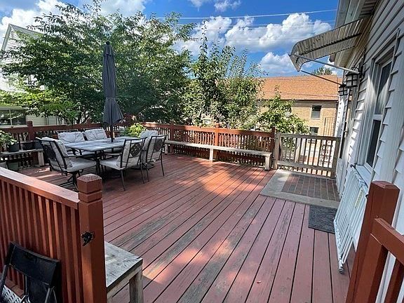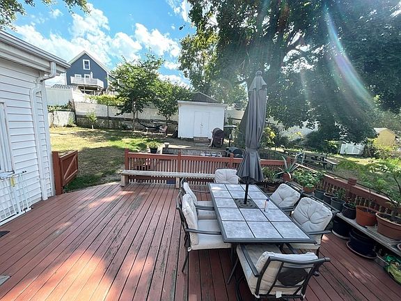 Definitely not a drive-by! Walk up the stone steps to a beautiful wood deck with built-in seating, separate garden area with fruit trees, and enclosed yard with more fruit trees and a large storage shed. Spacious master bedroom has a walk-in closet and 2 large closets. 2 more bedrooms and bathroom on 2nd level. 1st level has large living room with hardwood floors, main bathroom, 4th bedroom, large eat-in kitchen with center island and a bonus family room with built-in bench seating. Well-maintained home has many updates including newer roof, boiler, and garage door.