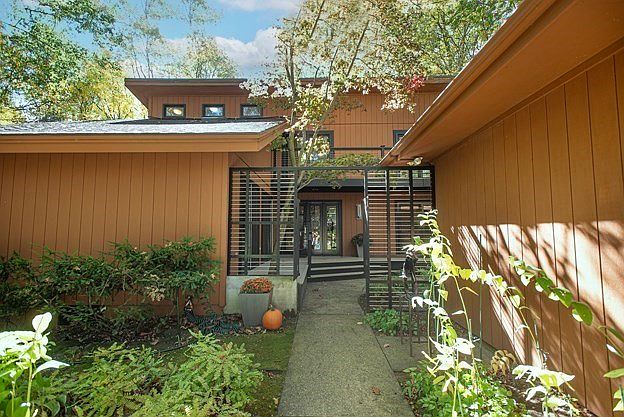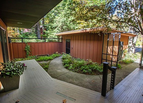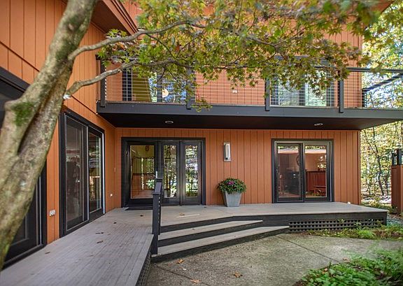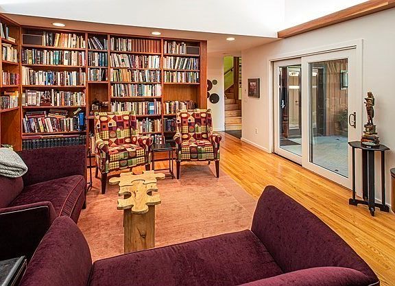 Striking contemporary home in a private wooded setting with access to Rt91, minutes to downtown, and easy access to Fitzgerald Lake conservation area. Architecturally redesigned in 2005, it offers a thoughtful floorpan with hardwood floors, decks and balconies on the main level and all of the upstairs bedrooms. Lots of glass brings the outdoors in, with a views of the courtyard from the living room/library featuring custom shelving, soaring ceilings and backlighting. The kitchen design offers plenty of custom storage and counter space, and an eat-in nook with views of the backyard. Large dining room w Ashfield schist fireplace, built-ins, a 4 season heated sunroom, plus a screened porch offers comfortable living space Upstairs are 3 bedrooms, 1 currently used as an office with built-ins, and a large remodeled bath with separate soaking tub and shower. The lower level which has its own exterior entry, has an office, bedroom, add'l kitchen, laundry, and bath. New heating system.
