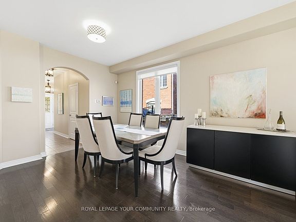 Your Search Ends Here! Don't miss this rare opportunity to own a beautiful 3-bedroom end-unit link home on a quiet crescent in sought-after Thornhill Woods! Featuring a 2-car garage and a driveway for 4 vehicles, this sun-filled home offers 9-ft ceilings, rounded corners, and dark-stained hardwood floors throughout the main level. The combination living and dining room boasts a charming bay window, while the modern kitchen includes stainless steel appliances, a pantry, and a bright eat-in area with a walkout to the extended patio and landscaped, fully fenced backyard - perfect for entertaining! Upstairs, relax in the cozy family room with gas fireplace and French doors leading to a walk-out balcony. The spacious primary suite features large windows, a walk-in closet, and a 4-piece ensuite with jacuzzi tub and large glass shower. There are two additional bedrooms, a 4-piece bathroom with private toilet and tub, an upstairs laundry room with stainless steel front loading washer and dryer, and a large linen closet that completes the upper level. The unfinished lower level includes a cold cellar and rough-in plumbing- ready for your personal touch. Ideally located near top-rated schools, parks, Community Centre, shops, public transit, GO Station, and Hwy 407. Move-in ready and waiting for you - this one won't last!