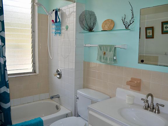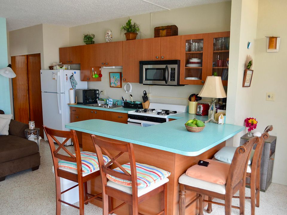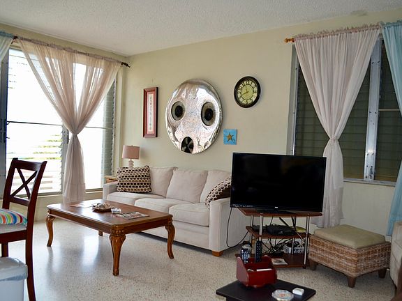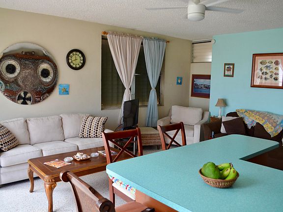 FIRST FLOOR END UNIT, this condo captures lots of light and breeze and has been so well maintained by its owners. Used only intermittently during the year, the condo has never been rented - but short- & long-term rentals are allowed! - and the impeccable condition reflects that. Recently polished terrazzo floors, updated kitchen appliances & bathroom vanity and cozy furniture make the condo completely turnkey. Gorgeous view of Buck Island, town and Hotel on the Cay from the living room and just a few steps from the large pool.