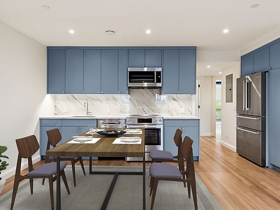 Inside, every detail reflects thoughtful craftsmanship: rift and quartered engineered white oak floors, acoustic insulation, solid-core doors with Baldwin hardware, and soft-close cabinetry. The kitchen and laundry are equipped with premium appliances, including a Bosch 800 Series French door refrigerator, Bosch Benchmark electric range and dishwasher, Bosch 800 Series microwave, and a full-size LG washer/dryer. Bathrooms feature Kohler's premium line of plumbing fixtures, a deep soaking tub or walk-in shower, ample
