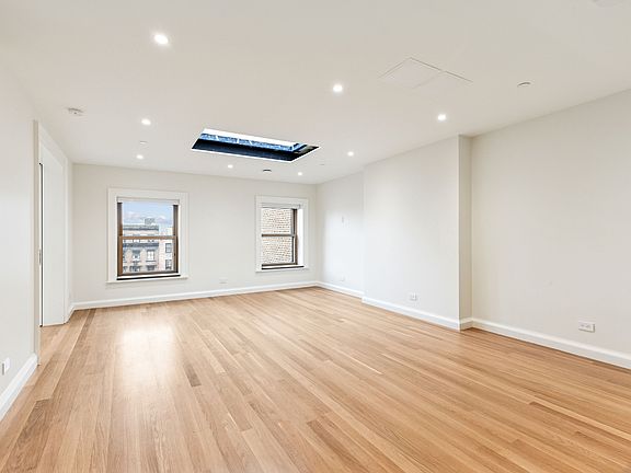 This residence, located three floors above the parlor, has been reimagined to Passive House standards, offering a living experience that is both sophisticated and sustainable. Skylights illuminate the interiors, filling the top-floor apartment with abundant natural light. High-performance south-facing windows brighten the space and open onto a private balcony off the bedroom.