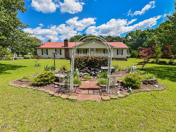 Tranquil country ranch floor plan sits on a 2.47 acre plot close to the Coty plant and 421 by-pass for easy commuting to the Triangle or Ft. Liberty. Metal roof & side entry garage with extra storage and concrete pad in front of the door. Driveway has fine crush and run laid down. Two goldfish ponds (one in front & one in back) that are filled by an existing well and contribute to the peaceful living here. No HOA or covenants. Home is on county water but the old well is still used for the goldfish ponds. Additionally, the home was hooked up to natural gas in the last couple years. Tankless Rennai gas water heater is about 2 years old. Gas log FP and gas heat as well. LVP floors & granite counters in kitchen which also has a pantry closet. Refrigerator, washer, & dryer convey. There is carpet throughout much of the home. If you have a need for storage and project space, this home is what you were waiting for. Aside from the extra space in the garage, there is a storage closet out back as well as a detached workshop and detached office/flex space with a window unit. Both of those outbuildings have covered porches. Separate dining room leads to an enclosed sunroom and covered deck patio. Covered front porch as well. Master suite features WIC and the TV mount. Lot has 2 fig trees, a peach tree and apple tree too! See agent remarks for more