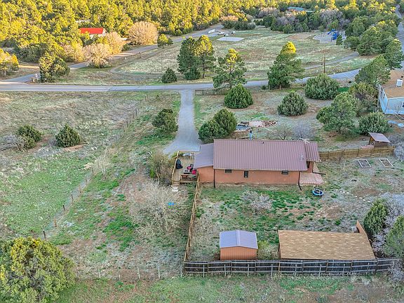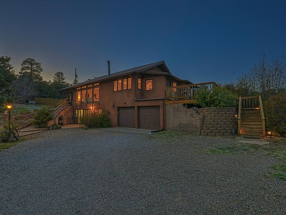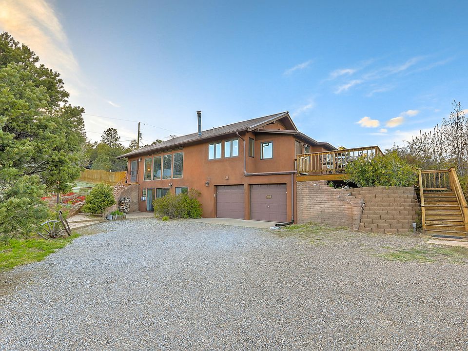 Welcome home to your mountain retreat! Located in Tranquillo Pines with very rare COMMUNITY WATER source! Spacious open floorplan with an updated kitchen and oversized island. Views for days. Large park across the street. Hardwood floors and adobe accents with a wood burning stove and passive solar make this home energy efficient. Not only does this home have 4 large bedrooms it also has a bonus room/office. The primary suite has a stunning view off the patio and an oversized closet plus a large soaker tub with floor to ceiling tile. Off the gorgeous deck you'll admire the stunning views with raised garden beds and fruit trees. Only 20 min to Tramway. Mountain bike, camping and hiking trails are less than 2 miles away. Don't miss this amazing opportunity.