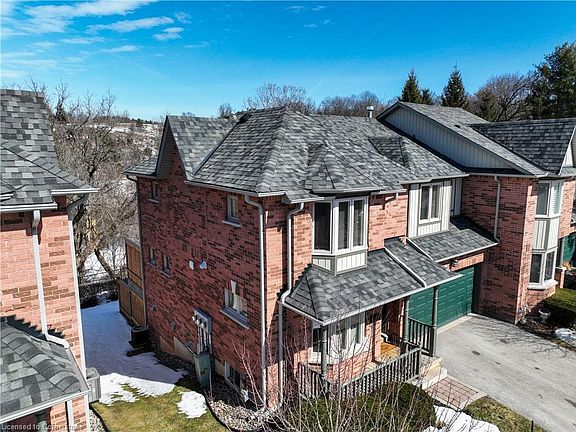 ***SEE VIRTUAL TOUR! This exceptional end-unit townhouse, with a 2-car garage, 2-car driveway, and backing onto the serene, treed Credit River, is one of only two units offering such a unique combination. Welcome to Daniels-built "Georgetown Estates," where you'll enjoy year-round, meticulously manicured grounds with a Maintenance Fee covering all exterior upkeep. Enjoy breathtaking views of the river and mature trees from all rear-facing windows, providing ultimate privacy and tranquillity. Boasting over 1,800 square feet, this home offers the largest floor plan in the community across the main and second levels. Inside access from the garage makes loading groceries or golf clubs a breeze. The main floor boasts a spacious kitchen with a bay window overlooking the front of the home, while the dining room opens to a new 33' x 10' deck with a natural gas BBQ line, perfect for entertaining or relaxing with a coffee. The living room features large windows that flood the space with light, offering scenic views of nature. On the second level, the family room with a cozy gas fireplace overlooks the stunning views through the oversized windows. The convenient second-floor laundry is located near the 3 bedrooms. Two 2nd level full bathrooms include a 4-piece ensuite and a main bath with a Solatube skylight. The basement is ready for your personal touch, offering the potential for a bedroom, family room, or office. It includes a walk-out to a covered stone patio and a rough-in for a fourth bathroom. Home is roughed in for a central vacuum system. Monthly condo/maintenance fees cover building insurance, common elements like the private community pool, visitor parking, and exterior maintenance (roof, windows, doors, driveways, decks, lawn care, and snow removal). This home comes with all appliances, owned HVAC, window coverings, light fixtures, and a garage door opener with keypad and remote. Discover why you'll want to call this property your HOME!