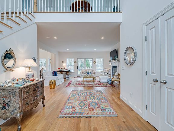 Just a few minutes to Southampton Village and a few more to ocean beaches, this light-filled and beautifully finished shingled traditional, a total of .76 acre. The four bedroom, three and a half bath home provides 2,476+/- sq. ft. of living space on two floors, along with an additional 1,322+/- sq. ft. in the lower level, which could be finished. Enter from the columned front porch to a double height foyer, which flows to open living areas including a living room with fireplace and glass doors to a rear patio, bright dining area and high end kitchen with marble countertops and stainless steel appliances including a Wolf range. A first floor master suite has glass doors to the patio, and a bath with double vanity, porcelain plank flooring and frameless glass-enclosed shower with basketweave marble tile flooring, subway tile walls and overhead and handheld sprays. A powder room is also on this level. Upstairs a second living room has a fireplace and vaulted ceiling. A second master suite includes a bath with the same features as the downstairs master bath. Two additional bedrooms share a third full bath with tub/shower, porcelain plank floors and white vanity. Additional amenities include central air and room for a pool.