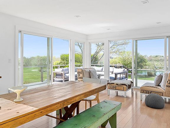 contemporary home offers a perfect blend of indoor comfort and outdoor splendor. Flooded with natural light, its semi-open floor plan welcomes you into a vaulted living room that seamlessly transitions into an eat-in chef's kitchen boasting top-of-the-line, Viking, appliances. This inviting home boasts five bedrooms, three featuring desk areas for work or play, while clean and crisp bathrooms adorned with marble and glass offer a touch of elegance. Unwind in the TV room or exercise in the fitness room fitted with a Peloton. The main living and dining areas feature walls of glass that welcome indoor/outdoor living and beautiful, uninterrupted views. Outside, the sprawling grounds are punctuated by lush flower gardens, a 25' x 50' heated gunite pool with a sundeck, a fire pit, hammock, and a pool pavilion all overlooking a serene agricultural backdrop. For water enthusiasts, a private dock grants direct access to Sagg Pond, ideal for kayaking or paddleboarding adventures. Being just a paddle away from Sagg Main Beach and minutes from Bridgehampton and Sag Harbor Village, this retreat offers the quintessential Hamptons experience.