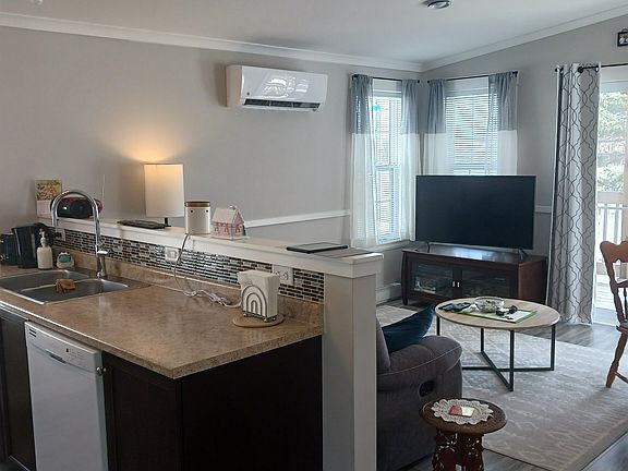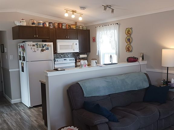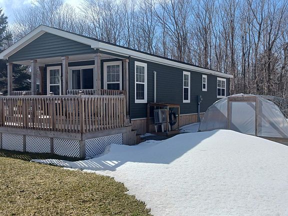 This affordable 5-year-old custom designed two-bedroom mini home offers affordable maintenance free living on a private lot with municipal water and sewer. Featuring a dual heat source with a heat pump as well as electric rads, two spacious decks, fenced in yard, paved drive, firepit, raised garden and two greenhouses. The spacious 4 piece bath has a laundry area and there is also large storage closet in the hall. The two-level shed (12 x 8) is insulated and drywalled with its own 60 amp service has a loft and an attached greenhouse and a storage lean to. Side deck is L shaped 14 x 13 and the two-level deck on the front is 16 x 12. Rear yard has a larger greenhouse and raised garden area. Frig, stove, dishwasher, microwave and stacking washer and dryer included.