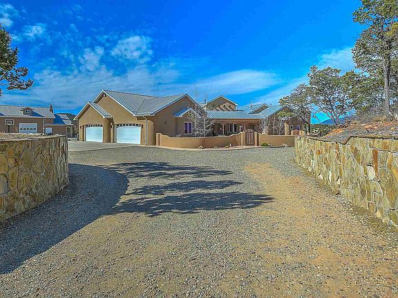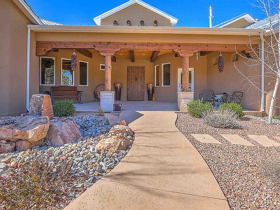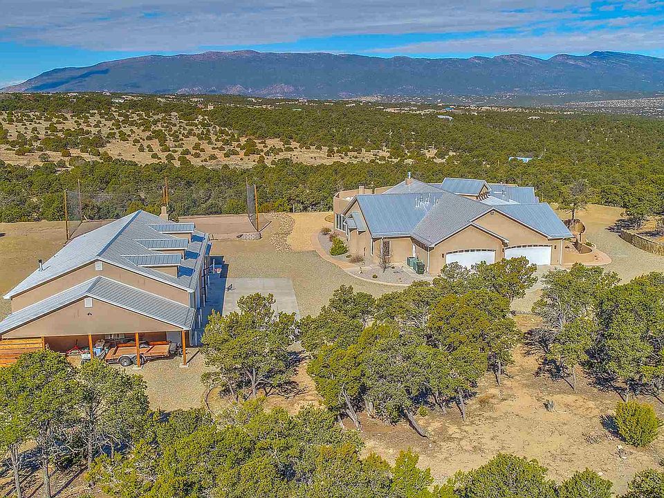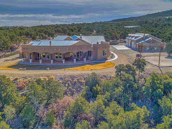 Spectacular views surround this exceptional custom home on 7 plus private acres just 25 minutes from ABQ international airport off of I-40. Hike, bike or ride your horse in the National forest. Main home with four bedrooms, three bathrooms, home office and wet-bar. Full Guest house and RV garage. Thermador appliances in a chef's kitchen with double ovens, 6-top gas stove, warming drawer and built-in refrigerator. Walk-in pantry and extensive cabinetry provide plenty of storage. Eat-in kitchen and breakfast bar as well as separate dining room for formal dinners. Bring the party outside to the extended patio, fire-pit, and volleyball court. Ambiance exudes throughout this high-end home including on-demand hot water, gas fireplaces, radiant floor heating and refrigerated air conditioning. Finished garage attached to main home with extended storage area. The guest house is fully equipped with kitchen, living area and fireplace. Attached workshop/garage is perfect for the car collector or hobbyist. A separate RV garage is attached to the workshop. Beautiful walled entry greets you at the electronic gated entry. Fully fenced.Year-round outdoor activities include hiking the National forest, netted outdoor sand volleyball, horse-shoes, greenhouse and endless spectacular views of sunsets.