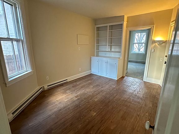 Charming, first floor, one BR apartment in desirable neighborhood. All freshly painted rooms! Brand new washer, dryer and above range microwave. Nice, "wood-like" LVT flooring and carpeted BR. Bedroom with closet, living room with built-in bookshelves and cabinet, eat-in kitchen and full bathroom. Rear porch with back yard. Electric heat and window air conditioner. One year lease required. Available April 1, 2025. One year lease required. Tenants pay all utilities. Electric, trash, sewer and water. NO SMOKING