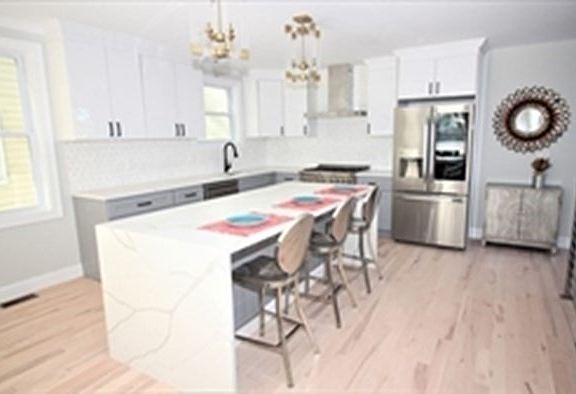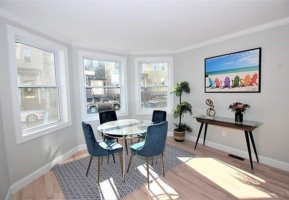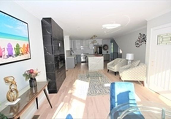 NEW CONSTRUTION. This huge 2 BEDROOMS AND 2 FULL BATHS and Half bath has so much to offer. Open concept 1st floor: chef kitchen with big waterfall quartz island, 6 burner gas stove, large vent, and drawer microwave; dining area; sunny living room with a beautiful marble electric fireplace. 1st floor master suite with full bath and walk-in closet. 1st floor also has good size 2nd bedroom, common bathroom, washer/dryer installed in unit, and a porch. Staircase with modern metal rail leads to lower level with a living room and main family room with walk-in closet, half bath, sitting area and sliding double doors to the patio and exclusive backyard(unfinished). Beautiful light fixtures and new energy efficient windows throughout. Located on a quiet and wide street with amble parking on both sides. Walking distance to the small beach and T-station. Staged pictures.