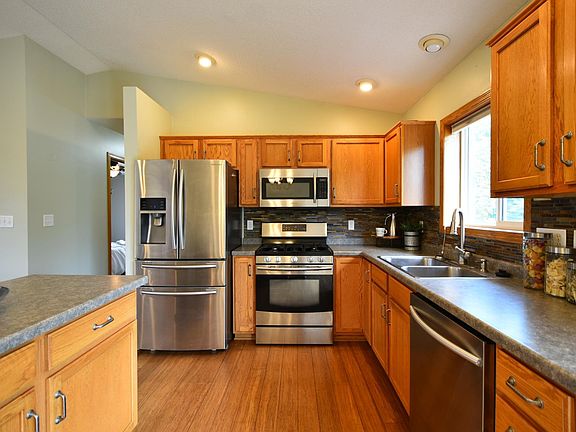 Welcome! Situated on a well-maintained lot, this property offers a fenced in backyard, ensuring privacy and security for outdoor activities. Inside the home the natural light flowing through the large windows enhances the open and airy atmosphere, vaulted ceiling adds to the spacious feel creating a warm and welcoming environment. Lower level has a cozy fireplace, perfect for those cold winter nights. The bamboo flooring adds a touch of elegance and durability, offering aesthetic appeal and easy maintenance. Currently designed with three bedrooms this home provides ample living space. With the addition of a single wall, one of the existing rooms could be converted into a fourth bedroom, providing flexibility and accommodating a growing family.