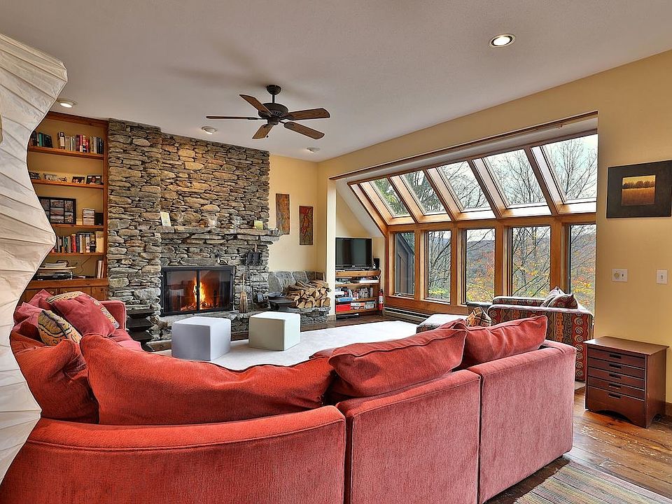 Cozy fireplaceFieldstone fireplacePicturesque viewsPine floorsSpacious family roomUpdated greenhouse windowsNatural light