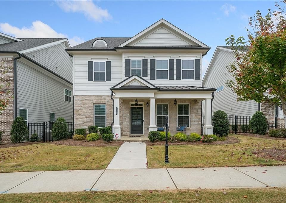 Welcome Home to this better than new construction home in the highly sought after gated community in Alpharetta. This home sits on a premium lot and overlooks the community greenspace. Built in 2021, this home showcases an abundance of upgrades including a main floor office that can be used as a 5th Bedroom, as it has a closet and private full bath. The Chef's Kitchen features stainless steel appliances, quartz countertops, a 10 foot espresso island, white cabinets with lots of storage. The eat-in nook leads out to a covered patio and fenced courtyard. The Kitchen opens into the spacious Great Room with built-in Cabinets and Floating Shelves, and a Gas Stone surround Fireplace. Upstairs, the Owners Suite boasts an oversized Bedroom and Sitting Area that leads out to a private Covered Deck with a hanging basket swing, perfect for enjoying your morning coffee or relaxing after a long day. The Owners Bath has Separate Vanities, a large Soaking Tub, a Separate Shower, and huge His and Her Walk-in Closets. A Secondary Bedroom with added windows has its own On-suite Bath, as well as two additional Secondary Bedrooms with a Jack and Jill Bath. The Laundry Room is conveniently located outside of the Owners Suite. The Community Amenities are abundant including the gated entrances, well lit Tennis Courts, a Swimming Pool, a Clubhouse, a Playground, and a 13 acre Park with Walking Trails and a Creek, exclusive to the community. Even better, you get the Alpharetta address with Forsyth County Taxes and award winning schools. This home is just 2 miles from Halcyon, featuring the new Trader Joes, less than 1/2 a mile from the upcoming McGinnis Ferry Exit of GA400, and just 4 miles from Avalon and Downtown Alpharetta. The monthly HOA dues cover all Lawn Maintenance, as well as Trash.