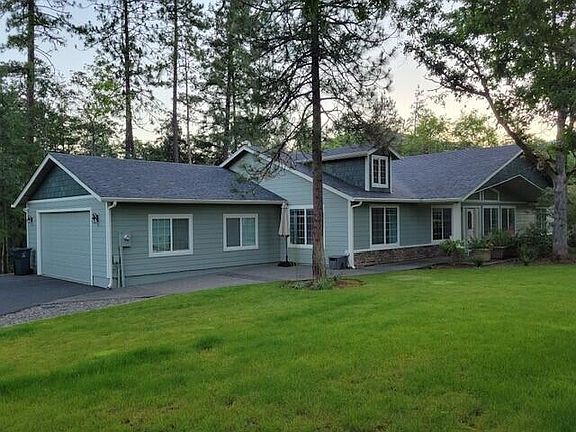 Lovely custom home in the North Valley, on 5+ acres. Light & bright, the home features 2,448 sq ft, 3 bedrooms, 2 full baths, plus, French doors lead to a nice den, open floor plan, vaulted ceilings & an abundance of windows! You are greeted with a travertine tile entry, spacious living room with fireplace, formal dining room & open kitchen with granite counter tops, breakfast bar & 2 pantries. Beautiful primary suite has a huge walk in closet & lovely bath with soaking tub. Enjoy evenings out on the covered deck or on the front patio. There is also a concrete pad that would make a great outdoor entertainment area or use your imagination. Exterior features include 2 car attached garage, paved driveway & gated entry.
