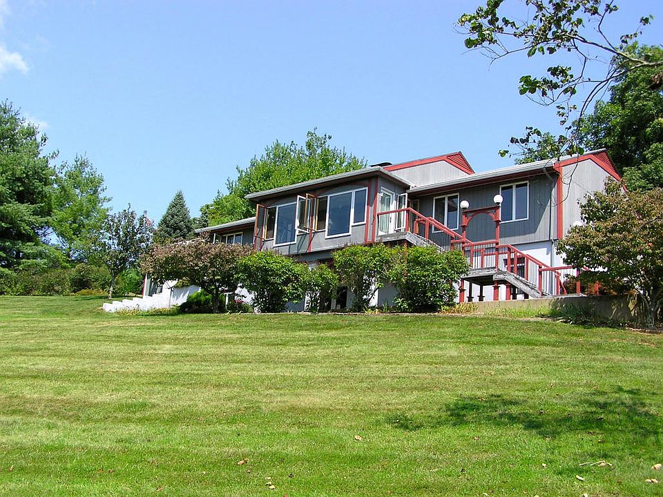 Elevated contemporary with 2 car garage on 5+ peaceful acres, only minutes to town! Dramatic wall of windows provides sunny rooms w/beautiful mountain & pastoral views. Wood floors, skylights, brick fireplace, sunroom & family rm addition. Lower level includes exercise room w/ hot tub, rec room, bath, spare room, workshop, & storage. Horses, chickens, goats, & sheep welcome. Space to garden!