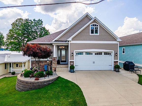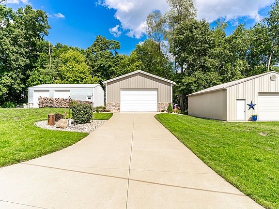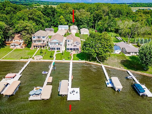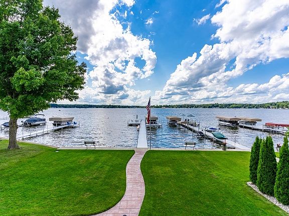 The Gold Coast on Crooked Lake! Great sandy beach and phenomenal sunset views are the pride of this amazing shoreline. Top of the line finishes and outstanding amenities in this custom built 4-5 bedroom, 3.5 bath, two story home on a finished walkout basement with 2 car attached garage. Includes a 28x60 detached garage on the back lot. Fantastic floor plan with an open concept great room, kitchen and dining area with access to the lakeside deck. Some amenities include a vaulted ceiling, gas fireplace, double paddle fan light fixture, up lighting, granite counter tops, tile backsplash, pantry closet, center island, breakfast bar, top of the line stainless appliances and an abundance of storage. Main level den with built in Murphy bed & closet, full bathroom and laundry room with custom cabinets, utility sink, built in ironing board, washer and dryer. Lower level family room with heated tile flooring, wet bar, beverage/wine refrigerator lead to a 3 season porch with remote screens. The primary bedroom suite is lakeside and features a trey ceiling, crown molding, heated hardwood floor, bathroom with heated tile floor, double sink vanity, granite counter top, custom tile walk-in shower with 3 shower heads and a walk-in closet with organizers. All guest bedrooms are on the upper level with a full bathroom. Feature sheet in associated documents. Some furniture may be available to purchase outside the sale.