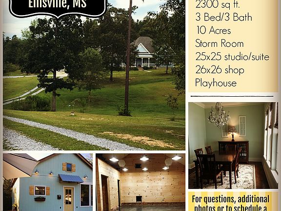 Beautiful cottage style home with 10 Acres, separate studio and separate shop - 3 Bedroom/3 Bath with office and storm shelter closet. Large kitchen, Living Room and Master Bath. Antique glazed cabinets and doors throughout, clawfoot tub and transoms over windows. Large front porch, patio in back, faux wood blinds throughout. Tons of storage space in attic. Stained concrete floors, doggie door access to laundry room area. Convenient to I-59 and 5 minutes from JCJC. South Jones School District. Separate 25x25 heated & cooled studio/suite ready for appliances and a 26x28 unheated shop with 16x26 lean-to. Playhouse included.
