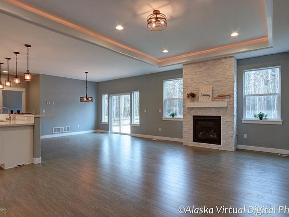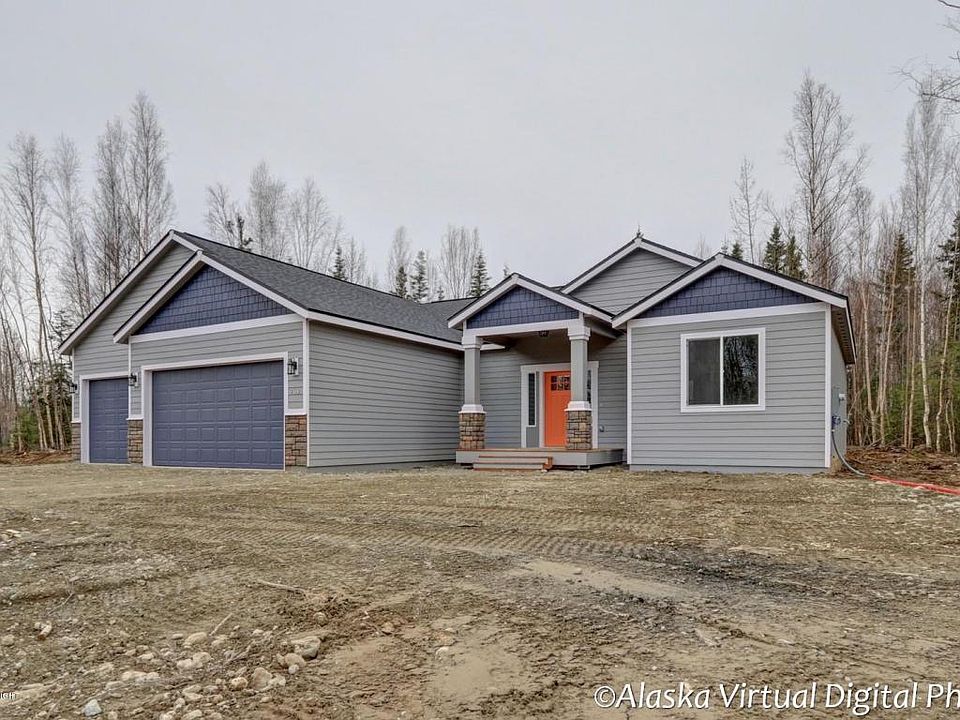 Beautiful custom ranch home with view on treed lot.Gorgeous rock fireplace, laminate wood/tile floors.Quartz countertops throughout,tile backsplash, SS appliances,crown molding on cabinets,pantry.Master suite,lighted tray ceiling,big walkin closet, private bath,separate tile shower,tub & double vanity.Open floor plan.Spacious 3 car gar,slider to deck,covered porch.(Photo Similar only for quality.)