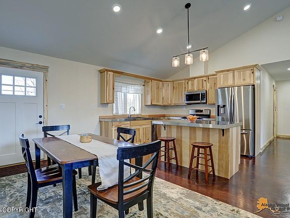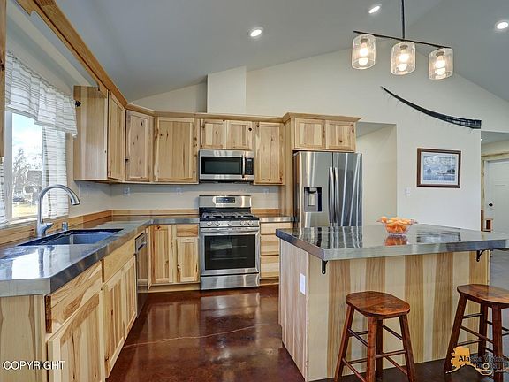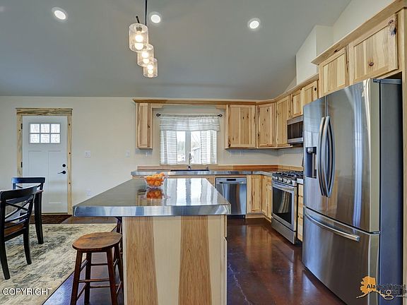 This ranch style home has something special for everyone. Custom concrete floors, with in-floor heating. Custom concrete countertops too! Custom bluestain pine doors and trim. Beautiful hickory cabinets. Lots of sunny windows to soak up Alaska's summer, and lots of winter sunshine too. Wellwater system has been upgraded with Reverse Osmosis water conditioning system. >>>Shop is 576 sq ft built previously, and updated in 2020, with new floor, drywall, paint. Lots of "toy" storage, and plenty of space to park an RV or trailer. In an established neighborhood with exceptionally easy commute to Anchorage. Brand new well and septic. Only 35 miles to the Muldoon Exit. HSA warranty.